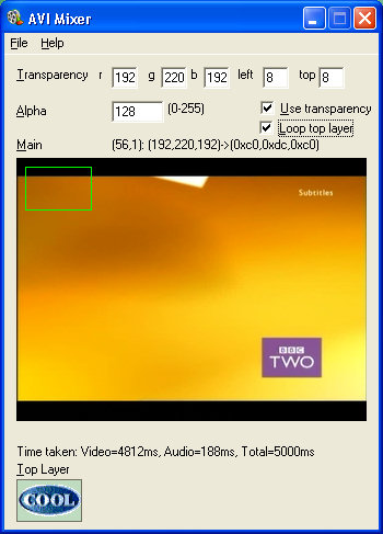 This example is a 15 second BBC 2 ident mixed with a rotating top layer AVI. This example took 5 seconds to process on a Celeron 370 (1.5GHz, 400 MHz FSB, 1Mb L2 Cache, 512Mb RAM, Windows XP Home).
